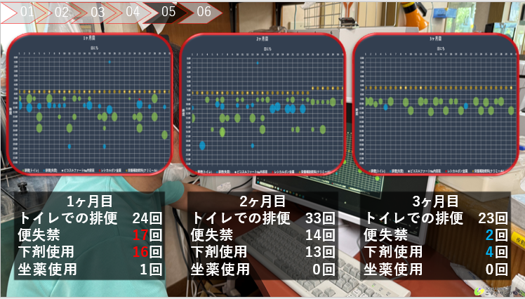 ただトイレに座って頂くだけではなく、データを集めて排泄のリズムを把握し適切なタイミングで座っていただくことでベッド上での失禁をなくし、
