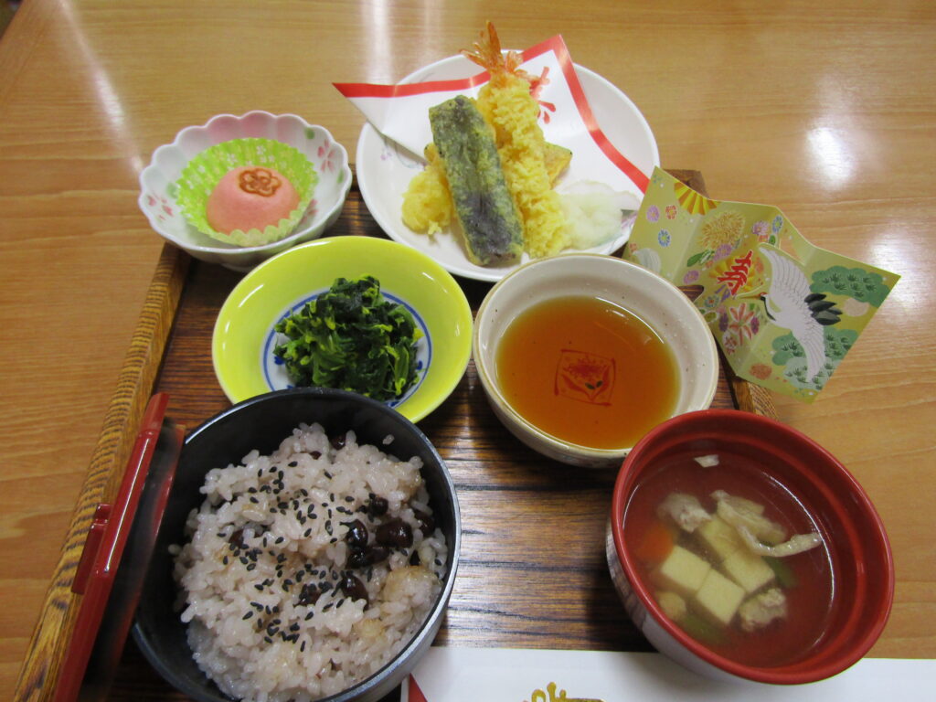お赤飯、7品目のすまし汁、天ぷら盛り合わせ、ほうれん草と菊花の三杯酢、祝いまんじゅう でした。