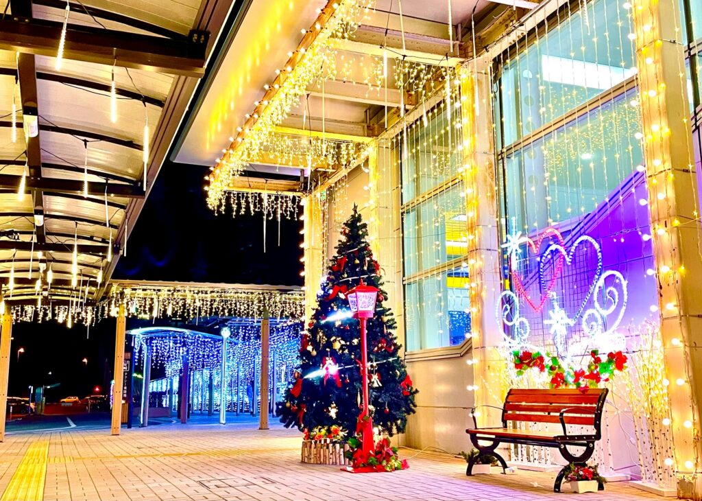 夜の街にはクリスマスツリーやイルミネーションが飾られキラキラしています